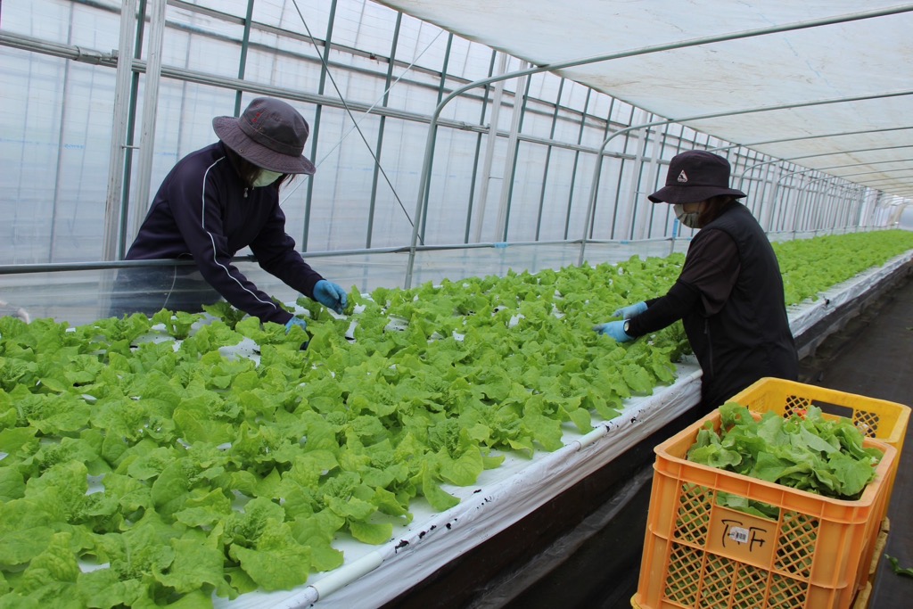 養液栽培なので、腰を曲げる作業はほとんどありません。この写真のように立った状態で作業を行います。