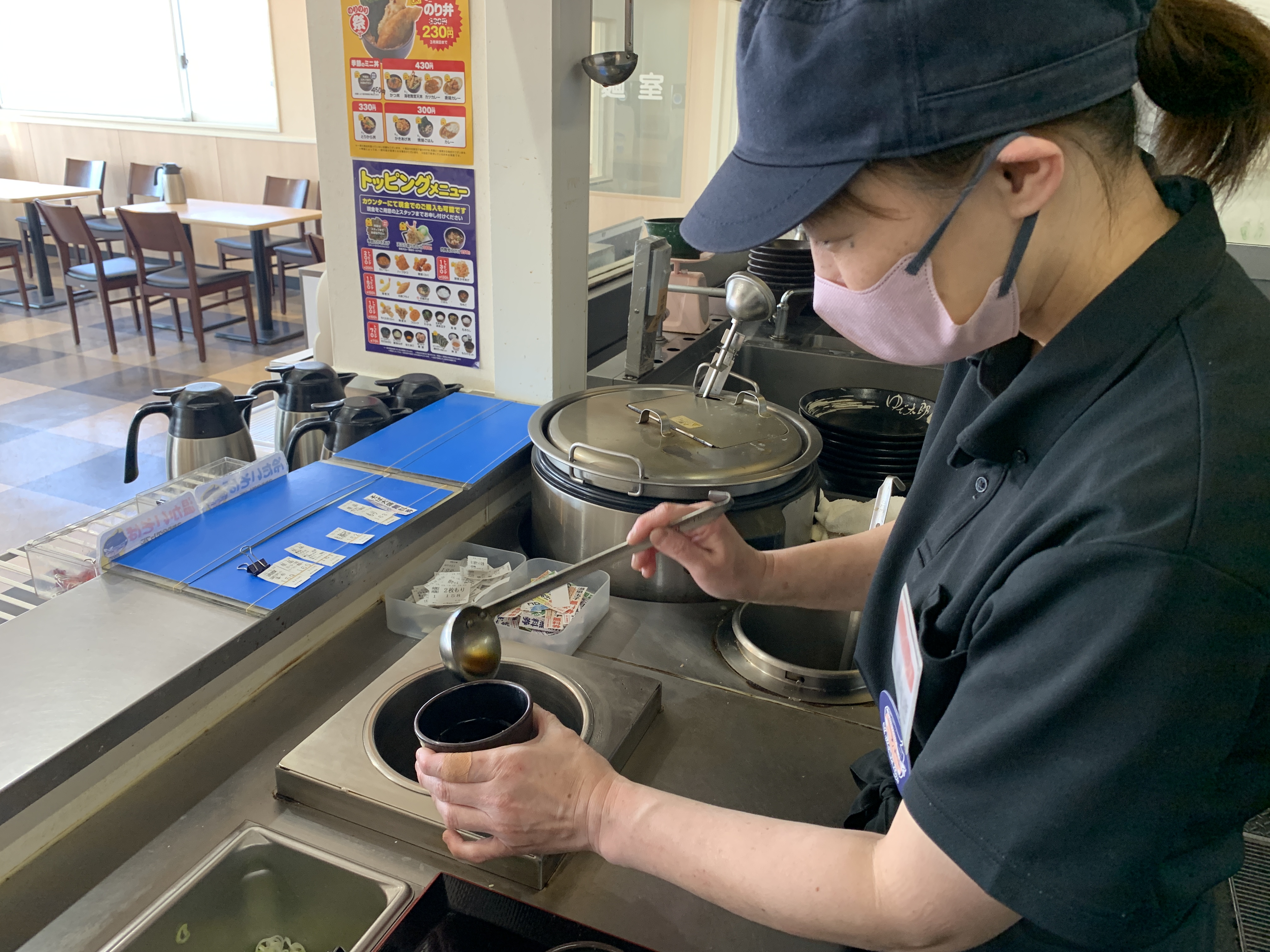 オシゴトはとってもシンプル!決まった量のつゆを器にそそぎます。