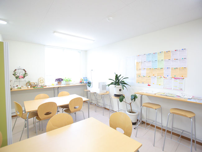 キレイな休憩室。この横には畳スペースもあるんですよ♪ 差し入れのおやつがテーブルに並んでいることもしばしば♪ 同年代のスタッフが多く和気あいあいとした雰囲気です。仕切りがあり、一人でゆっくりもできます。