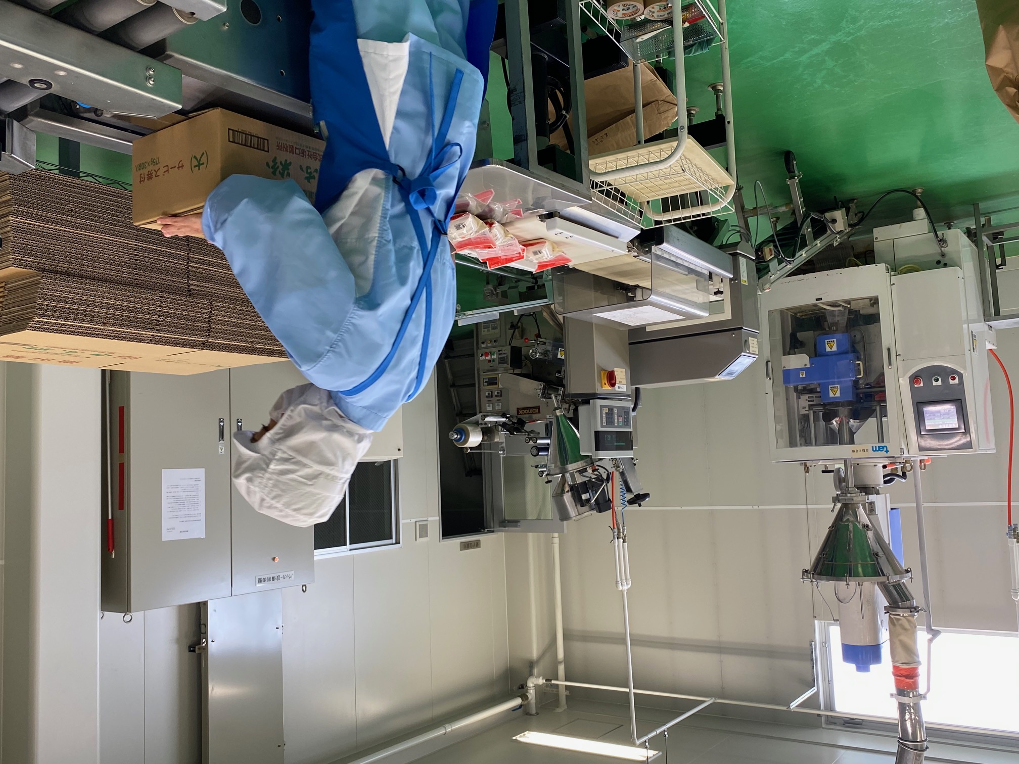 こちらが新人さんがまず行う箱詰め作業です。自動充填(オートパッカー)を導入しているので、すでに袋詰めにされた商品を決められた個数通りに箱に詰めていきます。