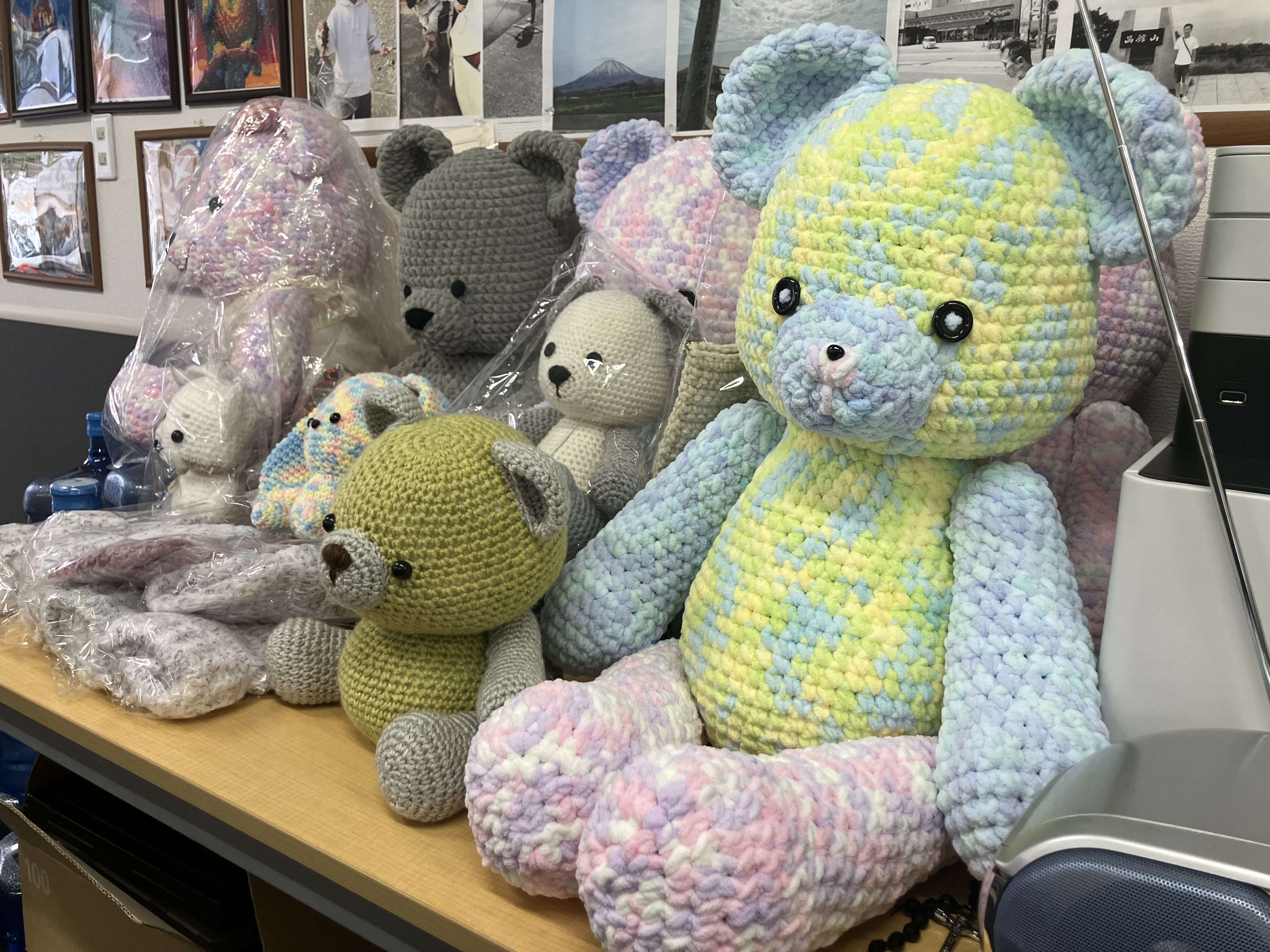 【ハンドメイド作品<1>】可愛いぬいぐるみを編んだり、裁縫や羊毛フェルトなど様々制作します。利用者さんが制作するので、私たちスタッフは制作時のサポートを行います。