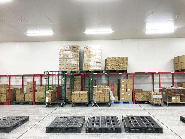 食品を扱うため、冷蔵庫内での作業です。皆さんニットやタイツなどで防寒しながら作業しています。