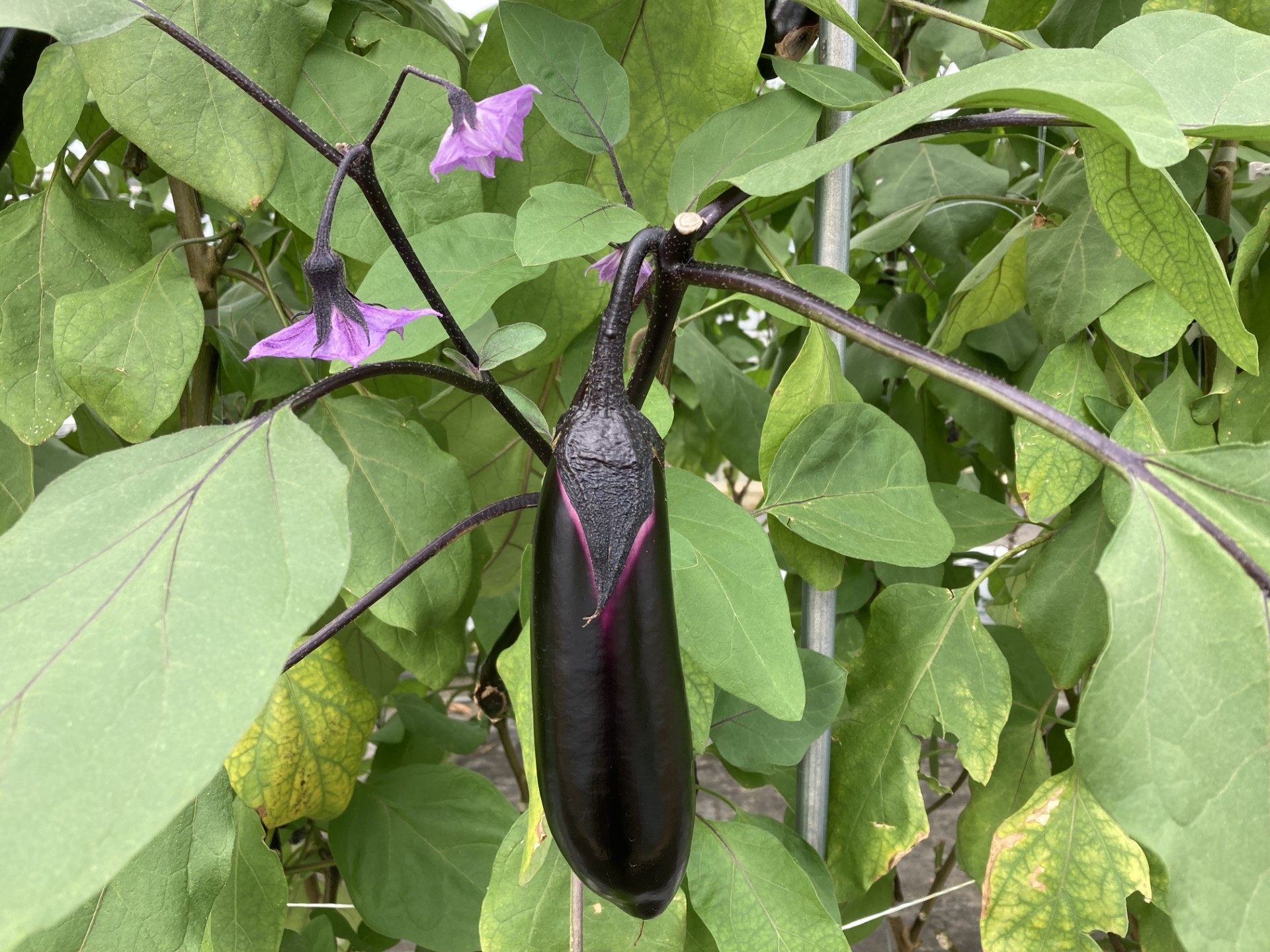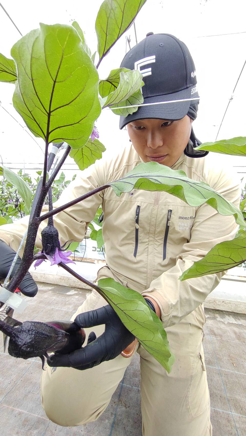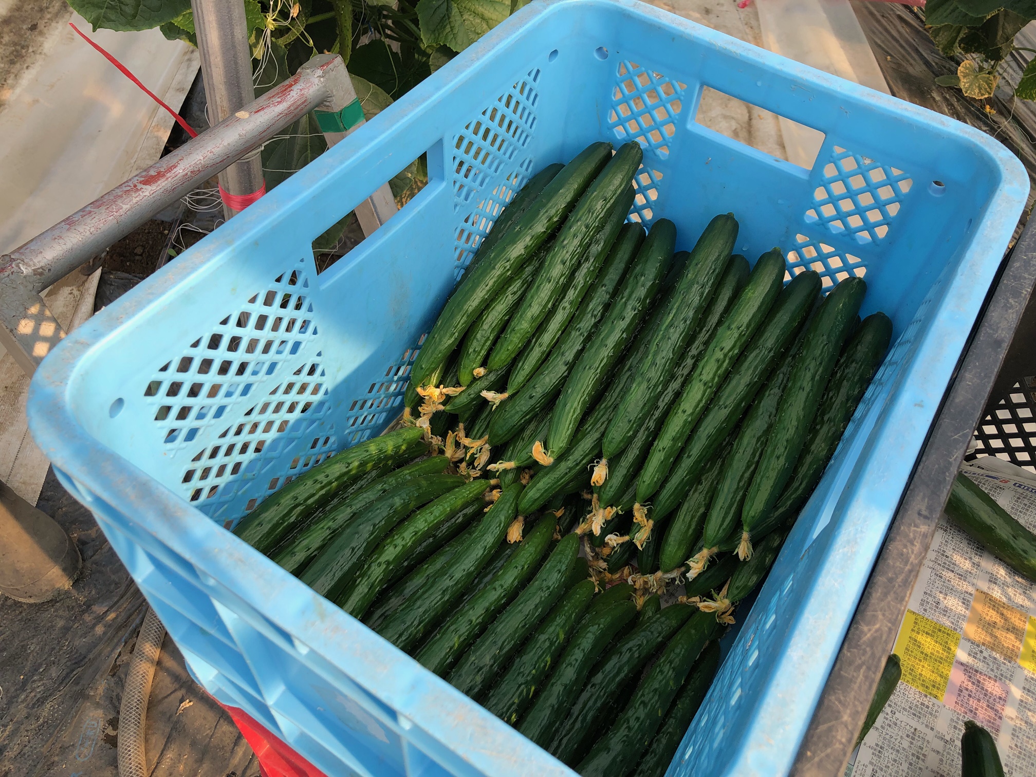 例えばきゅうりの場合のコツ→→ハサミの大きさがちょうどMサイズのため、ハサミより長いものを収穫→MサイズとLサイズに仕分け♪1棟を2人で作業。通路が4列あり、台車を使いながら収穫!
